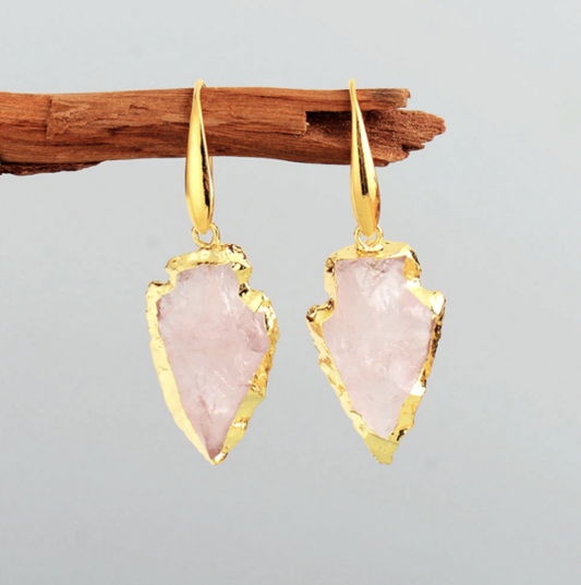 أقراط ذهبية من الكوارتز الوردي/الأوبسيديان برأس سهم