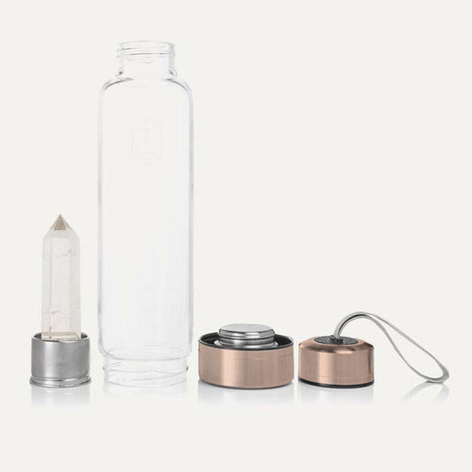 زجاجة مياه من الكريستال الجمشتي للشفاء زجاجة مياه زجاجية بها بلورات بنقطة من الجمشت ونقطة من الكوارتز الوردي