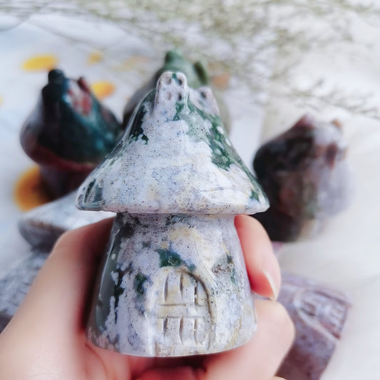 Moss Agate Mushroom House Natural Crystal Healing Chakra Decor